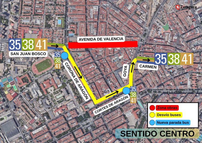 • En el sentido hacia el centro de la ciudad, las tres líneas diurnas emplearán el mismo desvío: por Corona de Aragón, Cortes de Aragón y retoman en Goya con calle Carmen sus itinerarios habituales
