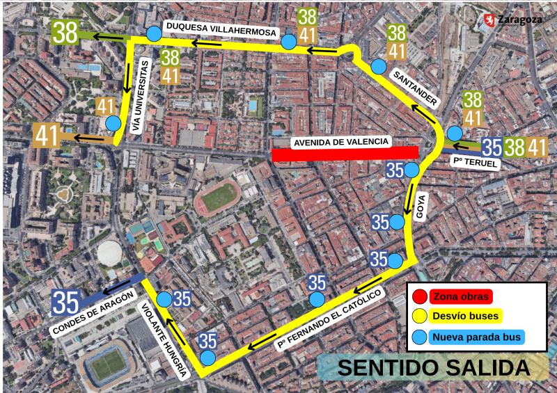 • Mientras, en sentido hacia Delicias, la línea 35, desde paseo Teruel, continuará por avenida Goya, Fernando El Católico y Violante de Hungría, para retomar su recorrido habitual ya en Condes de Aragón. Y las líneas 38 y 41 lo harán por calle Santander y Duquesa Villahermosa (la 38 sigue recta y la 41 torcerá por Vía Universitas para seguir por Gómez Laguna).