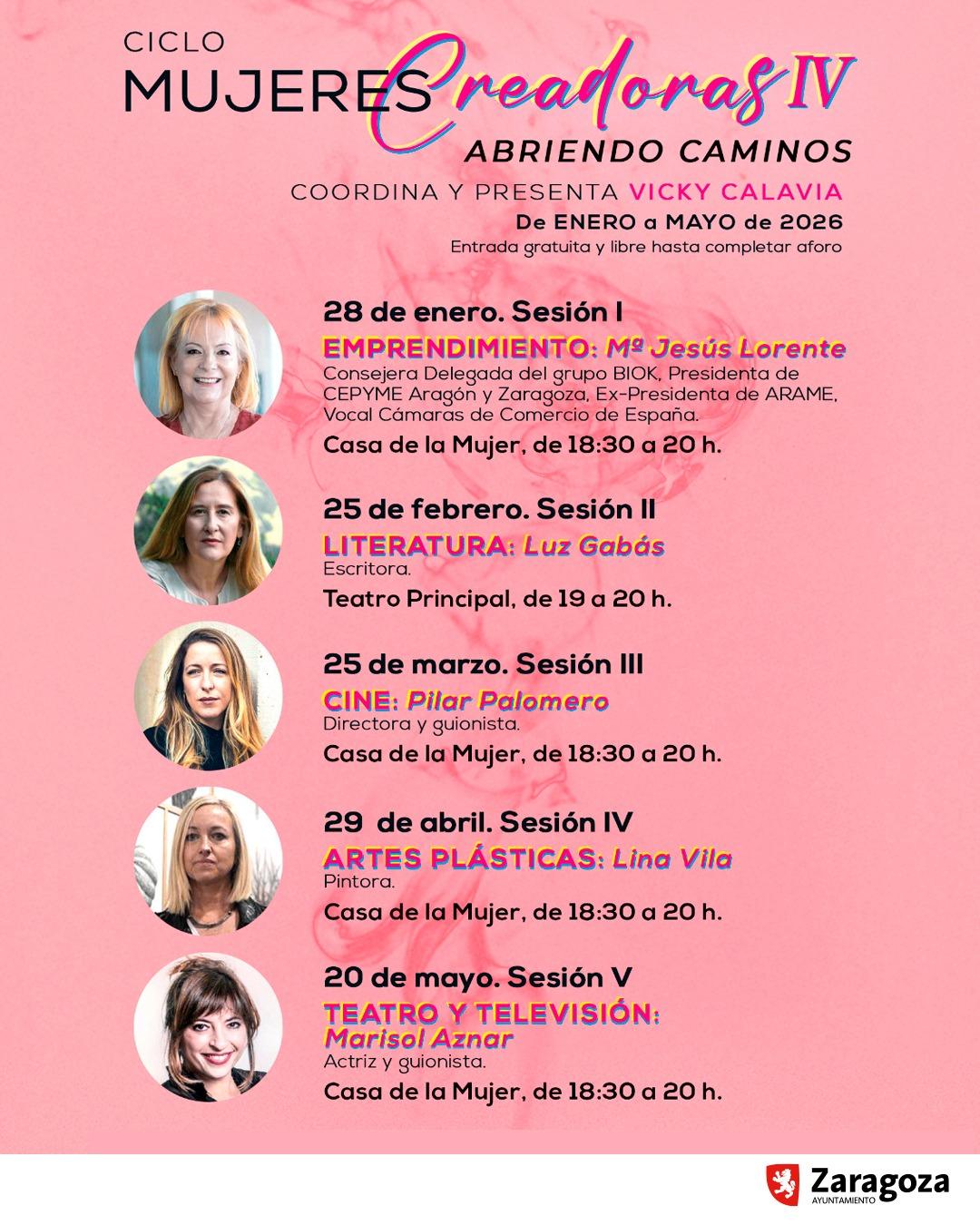 Con una vocación de continuidad, la cuarta edición contará con voces tan relevantes como Luz Gabás, Pilar Palomero, Lina Vila, Marisol Aznar y María Jesús Lorente para hablar de emprendimiento, literatura, cine, artes plásticas, el teatro y la televisión. Los encuentros, que llegarán hasta el mes de mayo, se realizarán en horario de tarde en el salón de actos de la Casa de la Mujer, salvo el de Luz Gabás que se ha programado en el Teatro Principal.