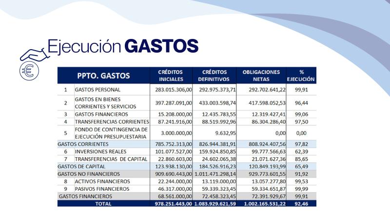 De este modo, los ingresos no financieros ascienden a 980.399.369,24 euros, un 99,3% de lo previsto. En cuanto a los ingresos financieros, que comprenden los activos y los pasivos financieros, se han reconocido 37.594.148,08 euros, el 38,9% de lo presupuestado.