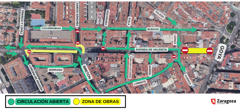 En concreto, los operarios deberán entrar a actuar en la conexión de Tomás Bretón con García Sánchez. Por eso, el tráfico que continuaba recto, deberá ahora subir en dirección hacia el Hospital Clínico, es decir, los vehículos que iban por Tomás Bretón y seguían por García Sánchez, como no podrán continuar, tendrán que girar hacia la izquierda y utilizarán un tramo de la avenida de Valencia. Esta situación, que durará cerca de dos meses, implica que los autobuses urbanos Ci3 y 22 deberán desviarse parcialmente de su recorrido por Duquesa Villahermosa para retomarlo después.